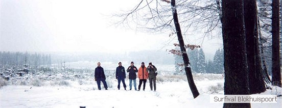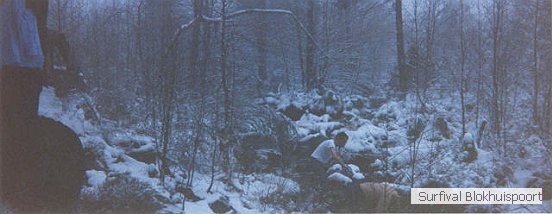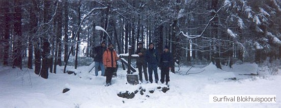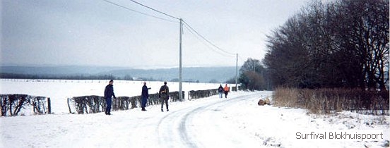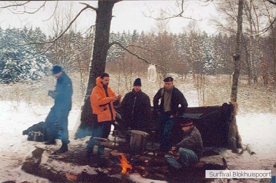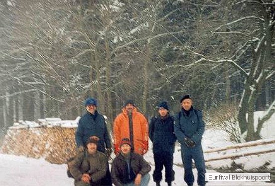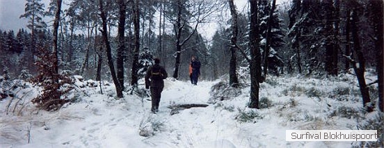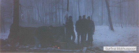 Het is donderdag 22 januari, mijn werk in het sober regime voor die week zit erop. Vanavond haal ik de bus die geschikt is voor negen man, deze konden we huren, voor het weekend in de Hooge Venen in de buur van Eupen, dat ligt in België. Hier houdt de groep, onder leiding van Klaas Veld en Frans V. Hek" een soort overlevingstocht die 1 keer per jaar en het liefst in de winter, gehouden wordt. Deze tocht werd gesponsord door P.O.V. Justitia. De wekker gaat om 6 uur af, het is tijd om op te staan, want om 7 uur vertrekken we vanaf de Blokhuispoort richting België, eerst haal ik Klaas Veld van huis en dan richting Blokhuispoort. Daar aangekomen zitten Dirk Edelenbos, Paul Kruyt en Frans v. Hek al bij de portier te wachten We laden de spullen in die ons helpen om het weekend goed door te kunnen komen. Daarna gaan we Willem Helfrich ophalen en als die is ingestapt rijden we richting het zuiden. Toen we het opgavenformulier voor dit weekend., 14 dagen voor die tijd bekeken. hadden zich 10 man opgegeven en daarom vonden we een bus wel zo geschikt en het is een stuk gezelliger dan in verschillende auto's. Een paar dagen ervoor vielen om bepaalde redenen 4 man af. Na 2 uur rijden, stopten we in de buurt van Utrecht om koffie te kunnen drinken en de tassen en vooral de kippen (6 stuks), die wij in een zelf gemaakt krat meenamen, even recht te zetten. Na ongeveer 20 minuten gingen we verder richting Eindhoven. Via Heerlen en langs het Drielandenpunt, reden we België in. Toen we 9 weken daarvoor afspraken om dan maar in het weekend van 23 en 24 januari op survival te gaan, hoopten we dat er sneeuw zou liggen. Toen we door het zuiden van Limburg reden, lag er al een dun laagje sneeuw. Hoe zuidelijker we gingen, steeds meer sneeuw. Na ongeveer 5 uur rijden, kwamen we aan bij een boerderij die ver afgelegen lag van de bewoonde wereld en boven op een heuvel stond. Zij die hier al vaker kwamen zeiden: je moet maar eens kijken hoe die mensen leven. Nou het was zeer oud en erg rommelig, maar verder was de boerderij wel groot, je zou er iets moois van kunnen maken. Toen wij ons meldden, kwam de boerin en verwelkomde zij ons. De trekker en de kar met brandhout stond al klaar, hier konden wij onze spullen op laden. De boer bracht ons naar het overlevingskamp, dat zo'n 200 meter van de boerderij af lag. Intussen hadden Klaas en Dirk een mooie plaats tussen 2 bomen gevonden. Daar sloegen wij ons kamp op. Je spant een stuk touw tussen de 2 bomen, hierover span je een stuk plastic, dit maak je met stukjes touw weer vast aan het touw tussen de 2 bomen. 'Te, hangt het zo vast dat de voorkant uit de wind is en het kampvuur je voeten verwarmd als je onder zeil ligt. Dit was wel nodig want op - sommige plaatsen lag wel 30 cm. sneeuw. Wat wij gehoopt hadden kwam uit, we hadden sneeuw. Om een kampvuur te krijgen, moet je wel vuur hebben en dat viel niet mee, vooral als die boer je nat hout geeft, levert dat problemen op. Maar door goed doorzetten van Dirk, lukte het uiteindelijk om het vuur aan te krijgen om ons te verwarmen. Hierna gingen we soep klaar maken, hiervoor heb je water nodig en dat haal je uit de beek die beneden aan de voet van de heuvel stroomt. Dit water komt uit een bron, dus is het te drinken, zeiden ze. Dat klopt dus wel want er mankeert ons nog niets nu ik dit stukje schrijf. Ik vind het een wonder dat het nog kan om zulk water te drinken. maakten zoveel soep, genoeg voor het hele weekend. Om 8 uur Is avonds wilde Klaas een eind wandelen, dus deden we dat maar. Het pad ging een heel stuk naar beneden, richting dorp hier de omgeving in het donker verkennen. Na ongeveer 3 uur gelopen te hebben keerden we terug in het kamp. Intussen was het vuur bijna uit, maar Dirk maakte het weer aan. Om 12 uur gingen we slapen, onder het zeil in de slaapzakken. Zelf ging ik op een andere plaats liggen, i.v.m. te weinig ruimte onder het zeil. Ik dacht laat mij maar dicht bij de kippen liggen, dan kan ik er oppassen. De bedoeling van de kippen die we meenamen was klachten, gaar koken en daarna boven het vuur eetbaar maken. Omdat we gingen lopen was er die avond geen tijd om de kippen te slachten. Voordat ik in mijn slaapzak ging, legde ik eerst nog een deken over het krat heen omdat het die nacht vroor. Dood gevroren 'kippen hoef je niet meer te slachten, dan hadden we ook diep gevroren. kippen mee kunnen nemen. Toen we de volgende ochtend wakker werden, tokkelden de 6 kippen nog. Doordat het vuur nog smeulde, hadden we het snel weer aan met wat droog hout dat ik "leende". (Ik breng het de volgende keer misschien wel terug.) Om je op te frissen, kun je je wassen in de beek, zelf ben ik een koukleum, wassen doe ik thuis wel weer. Hierna bakten we Turkse broden en maakten wat koffie. Daarna hebben we een natuur wandeling gemaakt in de omgeving. Verder maken we foto's van oorlogsmonumenten. In de pauze kregen we koffie met rijste vlaai. We vervolgden onze weg om langs een rivier langzaam naar boven, richting kamp, te lopen. Zelf vond ik het langs de rivier heel mooi. zigzaggend door het water, over stukken rots te lopen om dan langs de oever We kwamen bij een rots van ongeveer 25 meter hoog, 2 jaar daarvoor klommen ze hier nog omhoog, nu kan dat niet meer vanwege het afbrokkelen. Ernaast loopt een pad, dat lijkt op een trap, dit pas is zigzaggend ongeveer 100 meter lang, dus erg vermoeiend. Boven aangekomen moesten we dan ook even bijkomen. Hierna vervolgden we de tocht richting kamp. Af en toe vraag ik aan iemand, die er bekend is, hoever nog? Op een bepaald moment komt er een boerderij in zicht. Ja, daar is de boerderij met ons kamp, sommigen zeggen dat is nog niet mogelijk, maar als we op een kruispunt staan, herken ik iets, vooral dat boompje op dat pad, dan ik het voor mij wel duidelijk, niet het pad dat Klaas nog wilde lopen, hij wilde nog een uur omlopen. Gelukkig voor de groep dat we niet verder gingen, want Hans de gids van de vorige survival, stond ons op te wachten. We hebben het vuur weer opgestookt en onde
