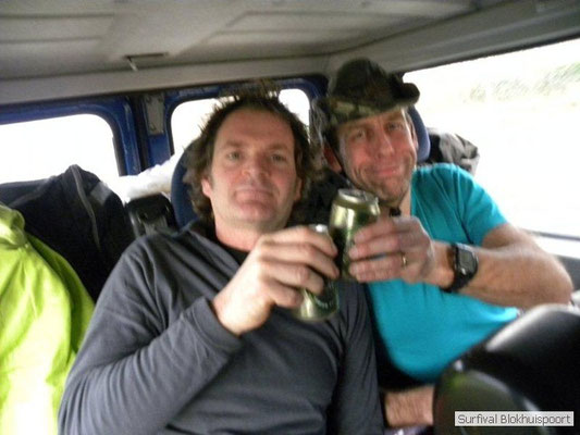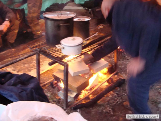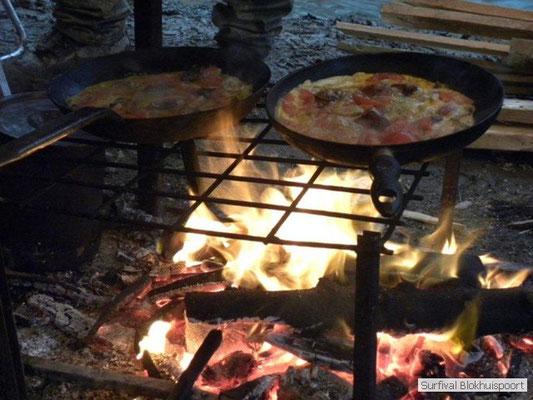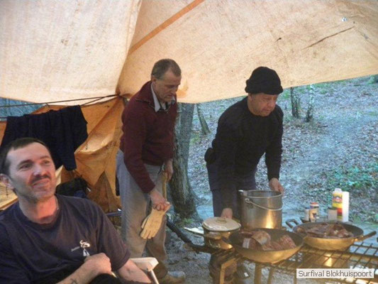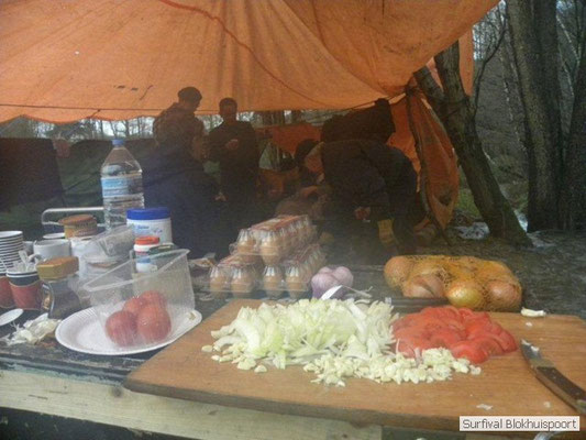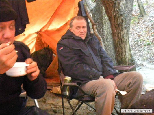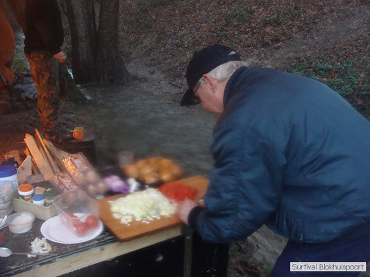 Hier kwamen de kwaliteiten van Dicky naar voren. Was hij de vorige survival de kelner van het kamp, nu ontpopte hij zich als een alcoholvrije keukenprinses die van twee ajuinen, een kilo look en deurmat-karbonades een feestmaal wist te brouwen. En zoals de meeste kinderen moest Frans na de karbonades op bed. Het was tenslotte al 20 uur. De avond werd omlijst met wind en vooral veel regen. Het nood rantsoen wat Cmndr Hans nog bij de pomp had gehaald, samen met koelvloeistof en pleisters voor zijn Volvo vloeide rijkelijk. Jupiler uit de fles! Sigaren en sterke verhalen. Het verhaal van Jan en zijn buurman. Ook de reden waarom de survival van vorig jaar niet door ging. Op de fiets naar het Oostblok. Jan op een degelijke fiets. Buurman op een Piet-Pelle uit 1953. Slapen aan de rand van de afgrond. Fietsen over het randje. Eten bij onverstaanbare oostblokkers. Orgaanvlees naar binnen werken en weer verder. Over de snelweg waar het spaak liep. Geen praat paal. Wel praters maar onverstaanbaar. Op zoek naar een fietswinkel. Wel een waar ze spaken verkochten van een Piet-Pelle uit 1953. Geen nieuw wiel, nee nieuwe spaken. Buurman hechte daar waarde aan. Het verhaal kende ook nog geen happy end, want het eind doel werd niet gehaald. Met de Trientaxi retour enkele reis. Trientsje blij en buurman kon zich opmaken voor een nieuw avontuur. Een vechtscheiding. Gelukkig was de winnaar van de Voice of Holland ook nog niet bekend. De mensen die het interesseerde lagen al met hun mobieltje uit te slapen. Omke & Romke en Royompré kauwden rond middernacht nog een karbonade weg. Heerlijk voor het slapen gaan. En de regen drupte onverstoorbaar door het lekke zeil.