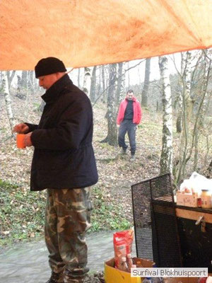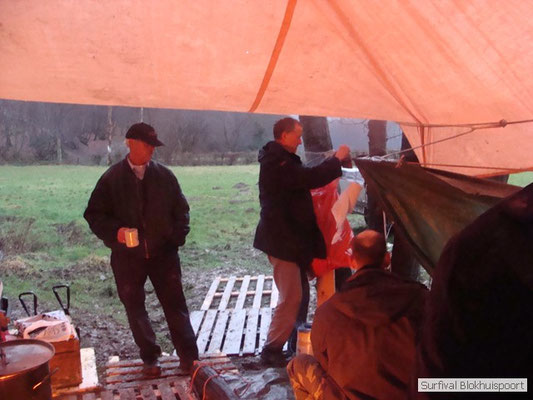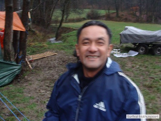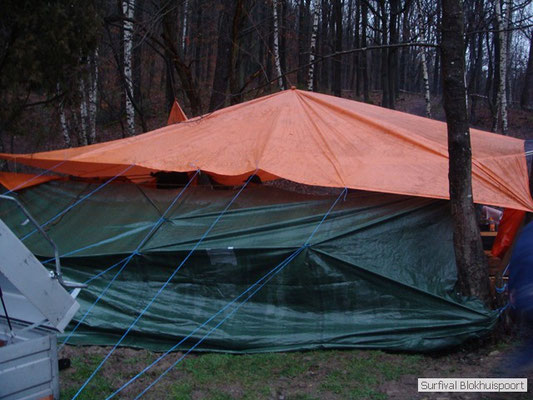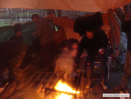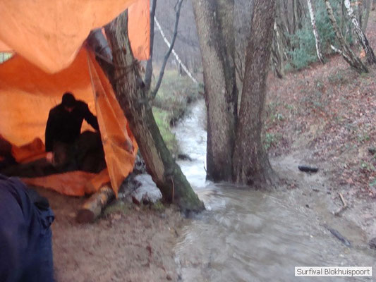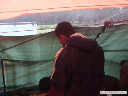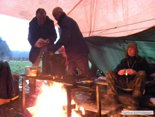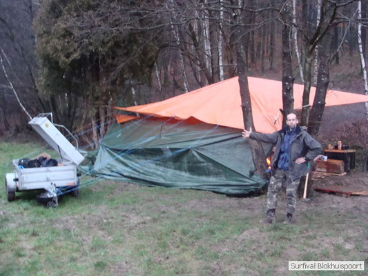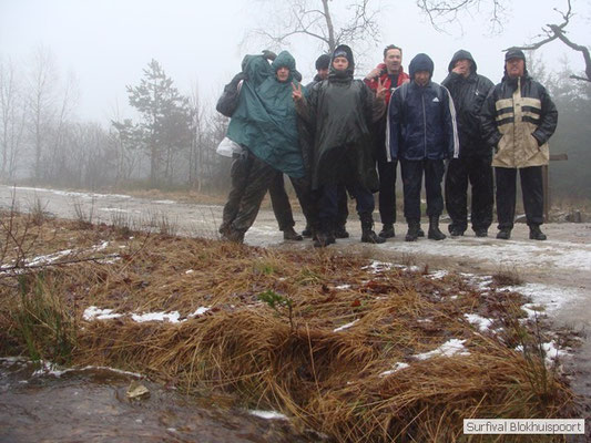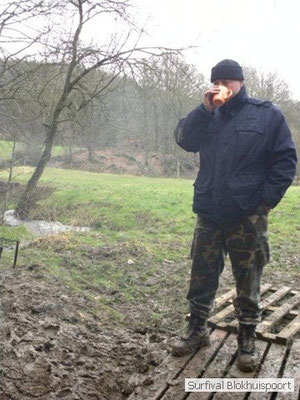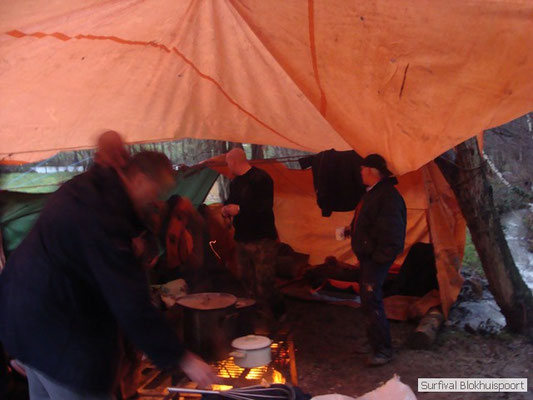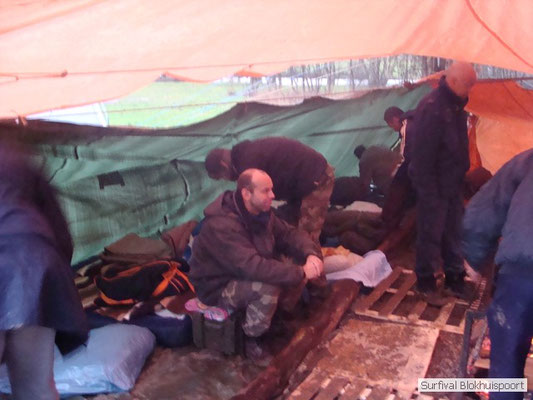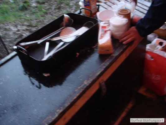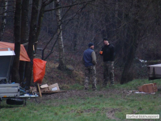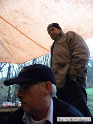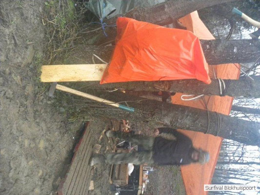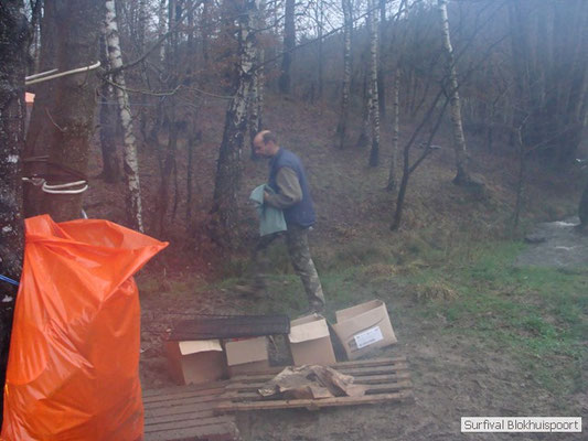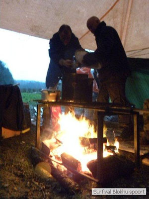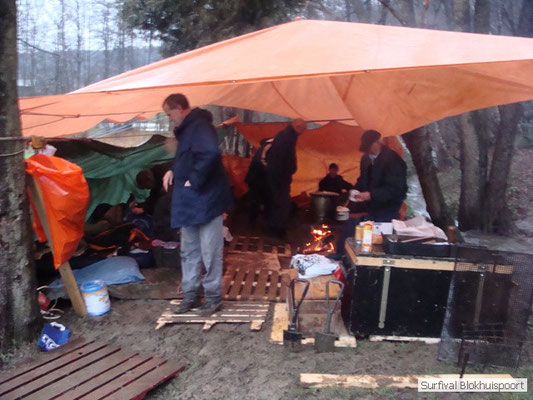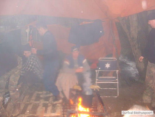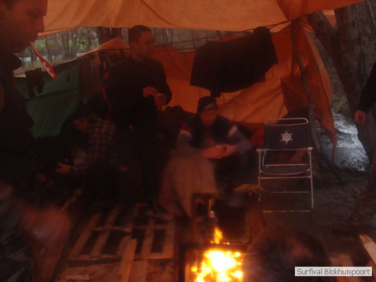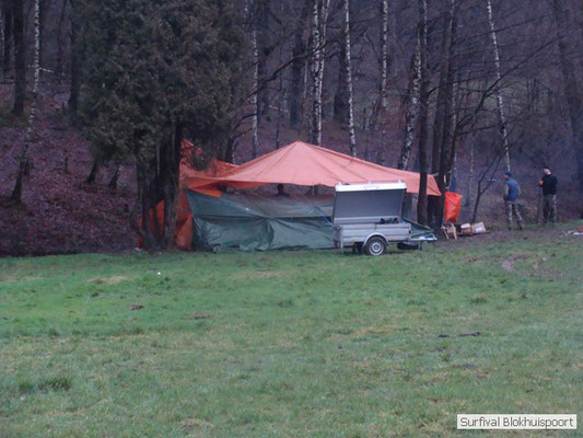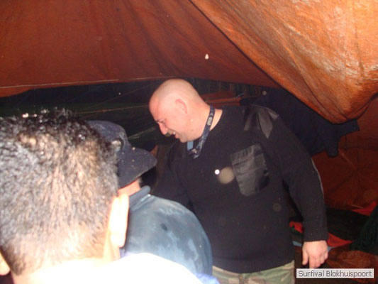 Wie wat bewaard heeft wat, en dus hadden we de gaten in het dakzeil net als andere jaren weer mee. Het kamp was dit keer twee maal zo groot als voorheen. Na een uur of twee stond het kamp en het water menig een al in de schoenen. Deputy Dirk had opmerkelijk veel last van koude handen. Dit ging ook niet over gedurende de survival. Sterker nog, we hebben zijn handen het hele weekend niet gezien. Af en toe een wijsvinger. De kar moest het veld op getrokken worden. Maar door wie? Commander Hans had de motor van zijn Volvo opgeblazen, Henk hielp m daarbij, Dirk had koude handen, Roy had telefoon en Frans was niet helemaal lekker (maar dat wisten we al). Bleef Jan over want geen evenement zonder toeschouwers. Bernie en Dicky hadden het ook druk met het aan elkaar knopen van de laatste eindjes van het kamp en Omke met het maken van kiekjes. Als laatste leek het Dirk wel handig om de tweede aanhanger met de bus, die we met veel pijn en moeite het veld op hadden geduwd, op te halen. Echter liep de bus tot aan zijn assen in de drek vast. Met zijn allen achter de bus en met Dirk aan het stuur duwden we de bus, met de handrem er op, het veld af. Ook het terug duwen van de bus en de kar viel ons zwaar. Dit keer wel zonder de handrem er op. Vanwege de recessie en de alsmaar stijgende olie prijzen en de angst voor de hond van het houtboerke uit Royempre (een borderline collie) hadden we zelf hout meegenomen. Jan had zelfs zijn schoorsteenmantel inclusief rook kanaal mee genomen. Ondertussen regende het vrolijk door. Er werd zelfs overwogen om een kano van het brandhout te maken, daar de stroom waar het kamp aan gelegen was, buiten zijn oevers trad.