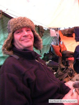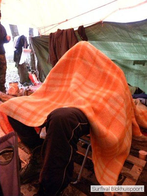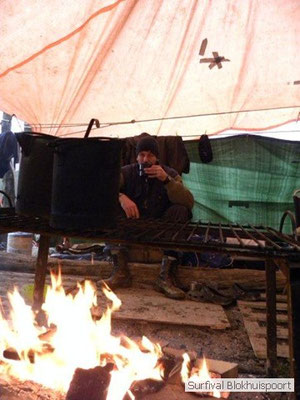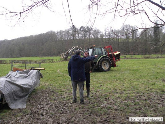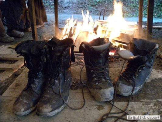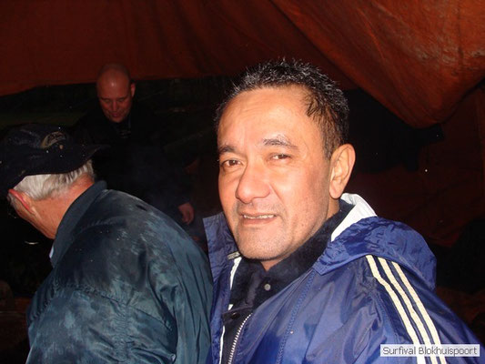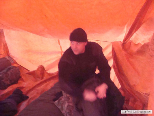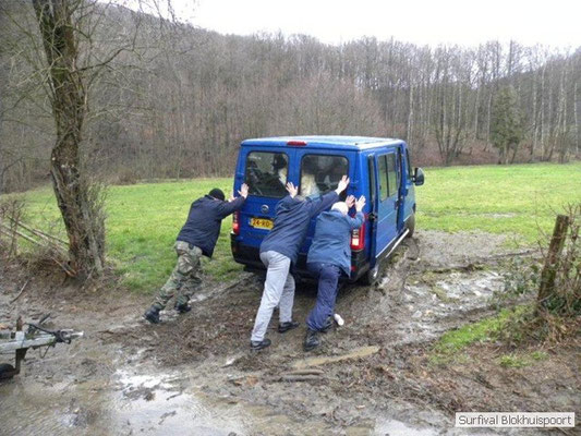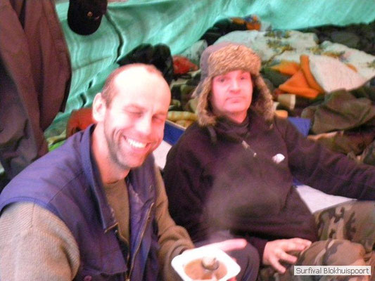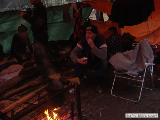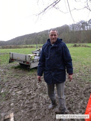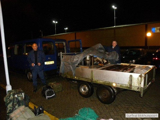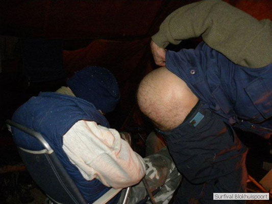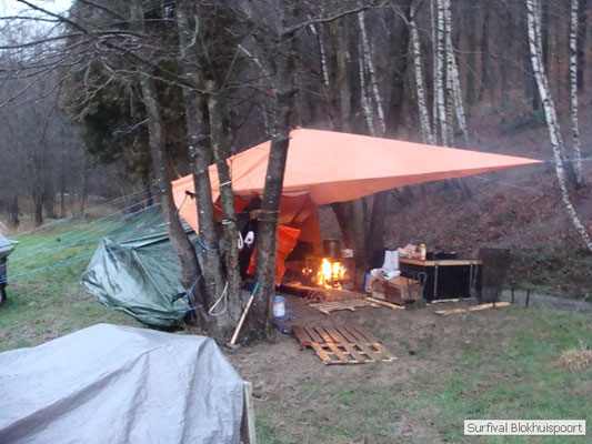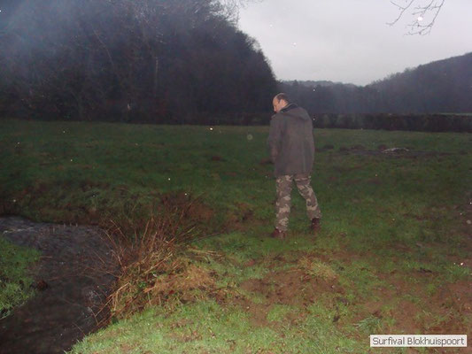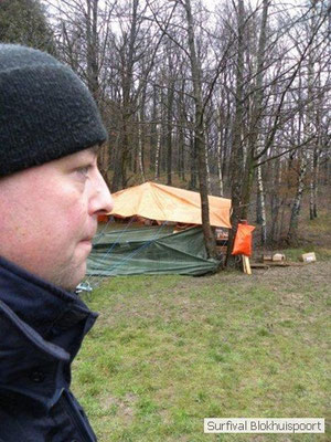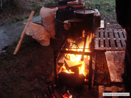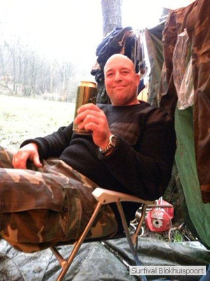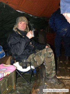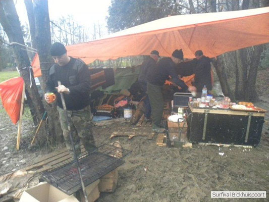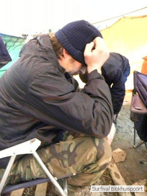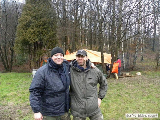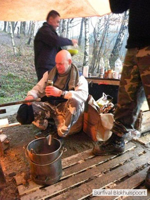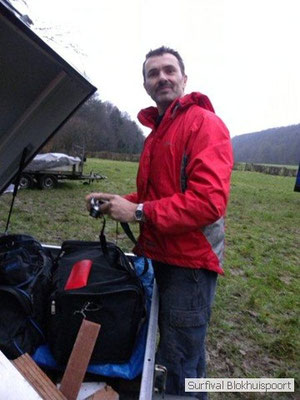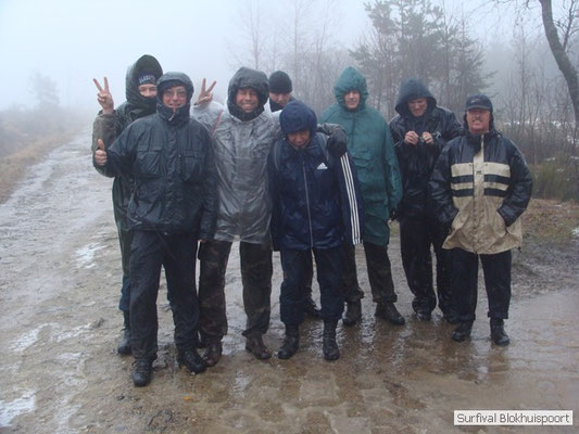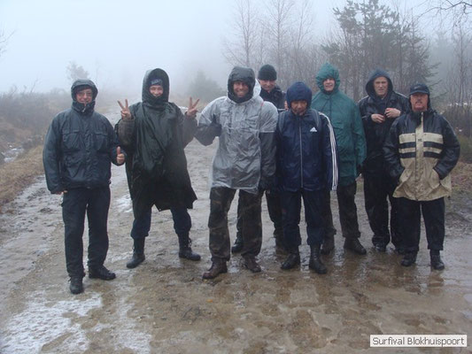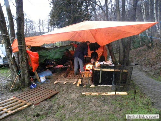Wie wat bewaard heeft wat, en dus hadden we de gaten in het dakzeil net als andere jaren weer mee. Het kamp was dit keer twee maal zo groot als voorheen. Na een uur of twee stond het kamp en het water menig een al in de schoenen. Deputy Dirk had opmerkelijk veel last van koude handen. Dit ging ook niet over gedurende de survival. Sterker nog, we hebben zijn handen het hele weekend niet gezien. Af en toe een wijsvinger. De kar moest het veld op getrokken worden. Maar door wie? Commander Hans had de motor van zijn Volvo opgeblazen, Henk hielp m daarbij, Dirk had koude handen, Roy had telefoon en Frans was niet helemaal lekker (maar dat wisten we al). Bleef Jan over want geen evenement zonder toeschouwers. Bernie en Dicky hadden het ook druk met het aan elkaar knopen van de laatste eindjes van het kamp en Omke met het maken van kiekjes. Als laatste leek het Dirk wel handig om de tweede aanhanger met de bus, die we met veel pijn en moeite het veld op hadden geduwd, op te halen. Echter liep de bus tot aan zijn assen in de drek vast. Met zijn allen achter de bus en met Dirk aan het stuur duwden we de bus, met de handrem er op, het veld af. Ook het terug duwen van de bus en de kar viel ons zwaar. Dit keer wel zonder de handrem er op. Vanwege de recessie en de alsmaar stijgende olie prijzen en de angst voor de hond van het houtboerke uit Royempre (een borderline collie) hadden we zelf hout meegenomen. Jan had zelfs zijn schoorsteenmantel inclusief rook kanaal mee genomen. Ondertussen regende het vrolijk door. Er werd zelfs overwogen om een kano van het brandhout te maken, daar de stroom waar het kamp aan gelegen was, buiten zijn oevers trad.
