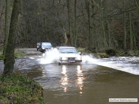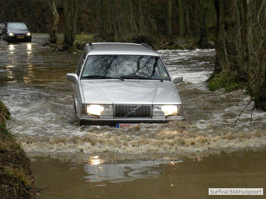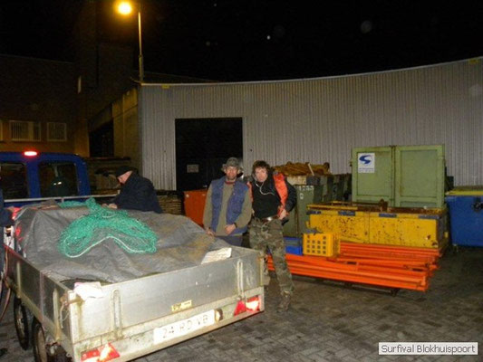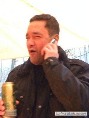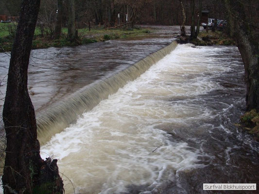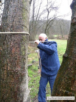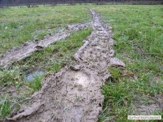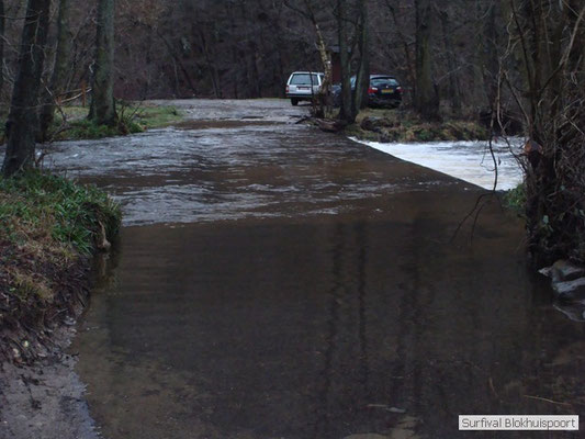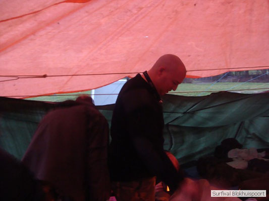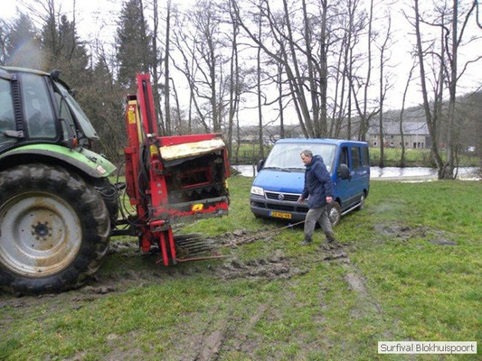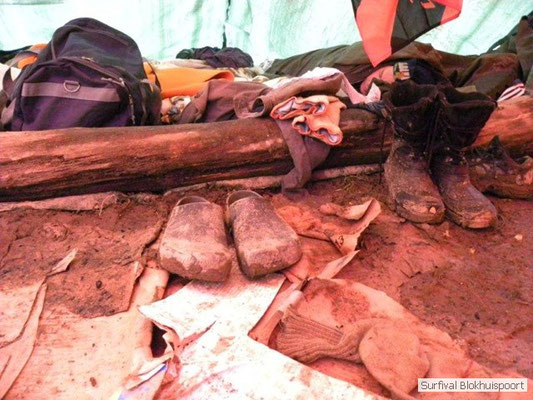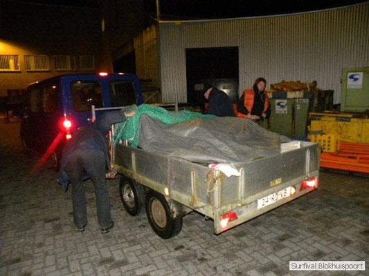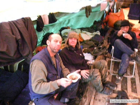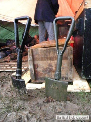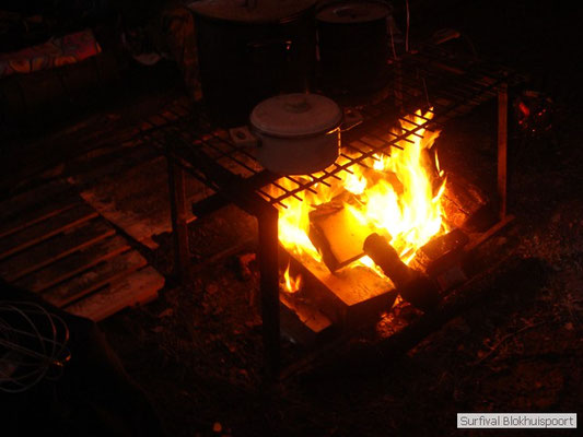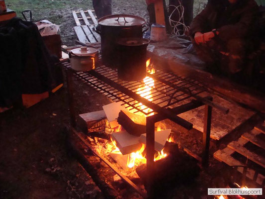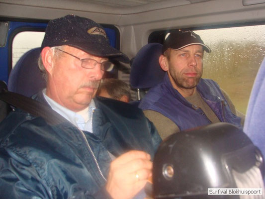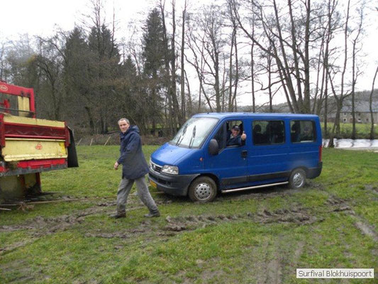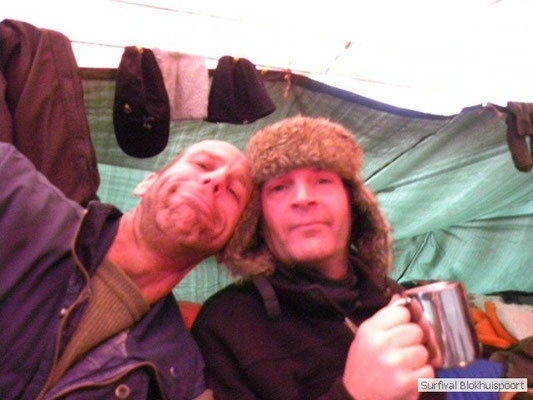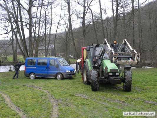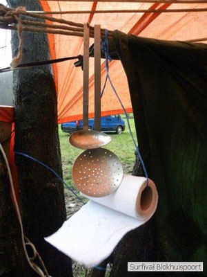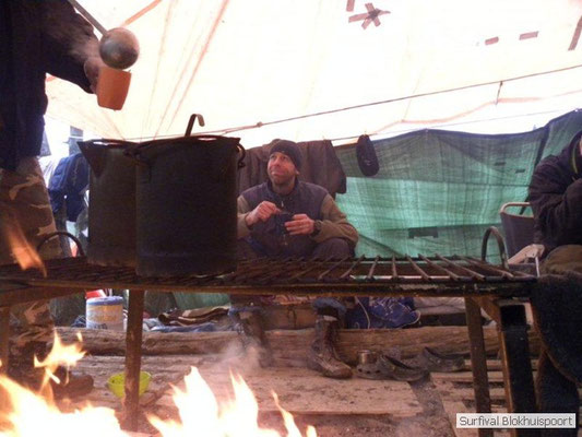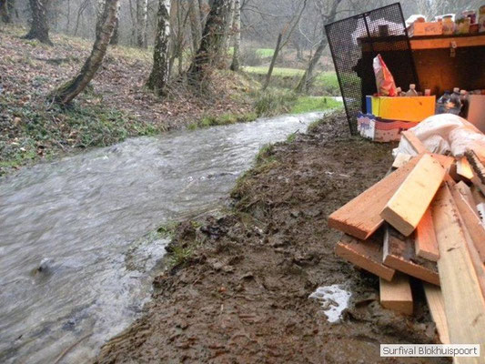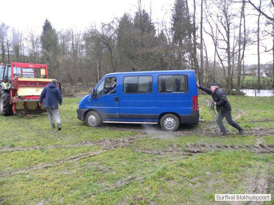 Wie wat bewaard heeft wat, en dus hadden we de gaten in het dakzeil net als andere jaren weer mee. Het kamp was dit keer twee maal zo groot als voorheen. Na een uur of twee stond het kamp en het water menig een al in de schoenen. Deputy Dirk had opmerkelijk veel last van koude handen. Dit ging ook niet over gedurende de survival. Sterker nog, we hebben zijn handen het hele weekend niet gezien. Af en toe een wijsvinger. De kar moest het veld op getrokken worden. Maar door wie? Commander Hans had de motor van zijn Volvo opgeblazen, Henk hielp m daarbij, Dirk had koude handen, Roy had telefoon en Frans was niet helemaal lekker (maar dat wisten we al). Bleef Jan over want geen evenement zonder toeschouwers. Bernie en Dicky hadden het ook druk met het aan elkaar knopen van de laatste eindjes van het kamp en Omke met het maken van kiekjes. Als laatste leek het Dirk wel handig om de tweede aanhanger met de bus, die we met veel pijn en moeite het veld op hadden geduwd, op te halen. Echter liep de bus tot aan zijn assen in de drek vast. Met zijn allen achter de bus en met Dirk aan het stuur duwden we de bus, met de handrem er op, het veld af. Ook het terug duwen van de bus en de kar viel ons zwaar. Dit keer wel zonder de handrem er op. Vanwege de recessie en de alsmaar stijgende olie prijzen en de angst voor de hond van het houtboerke uit Royempre (een borderline collie) hadden we zelf hout meegenomen. Jan had zelfs zijn schoorsteenmantel inclusief rook kanaal mee genomen. Ondertussen regende het vrolijk door. Er werd zelfs overwogen om een kano van het brandhout te maken, daar de stroom waar het kamp aan gelegen was, buiten zijn oevers trad.