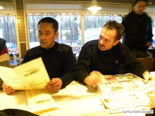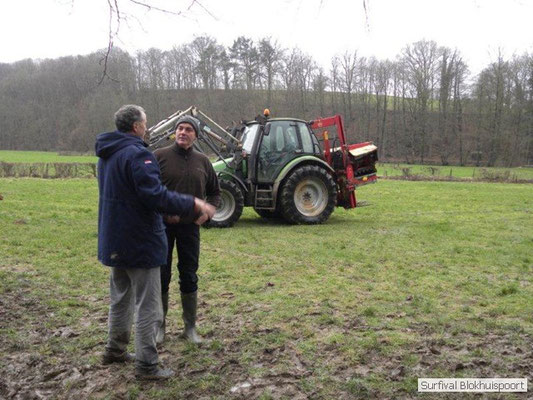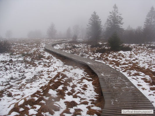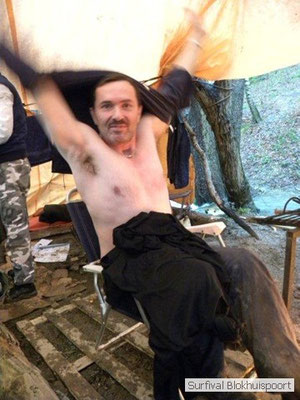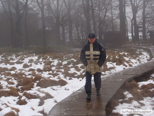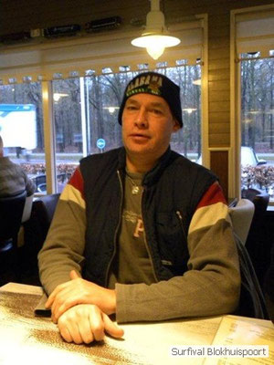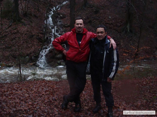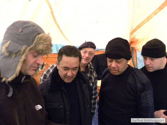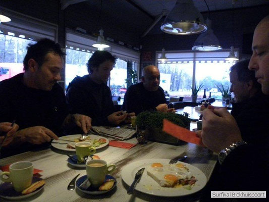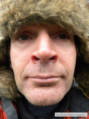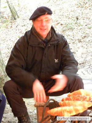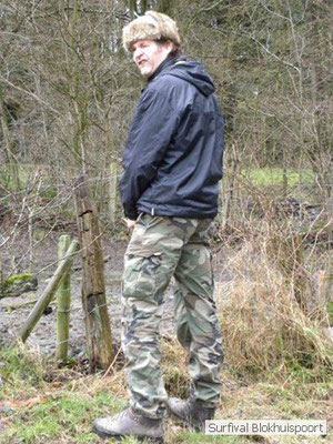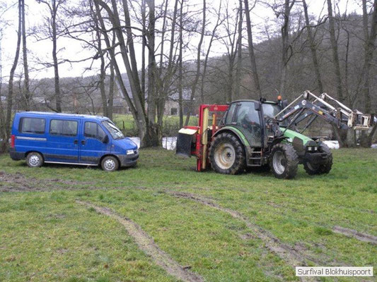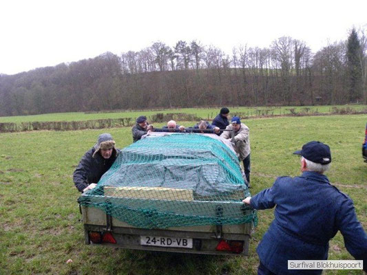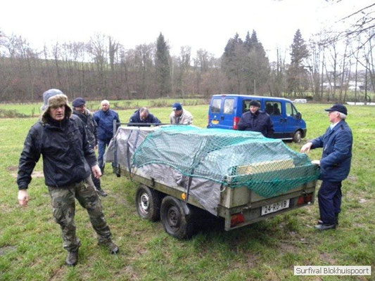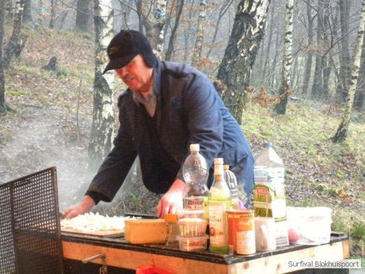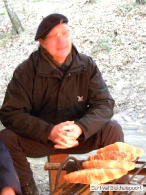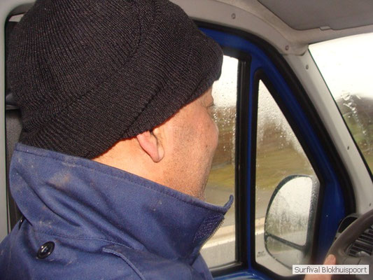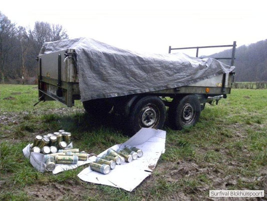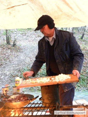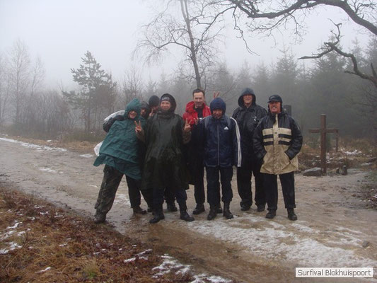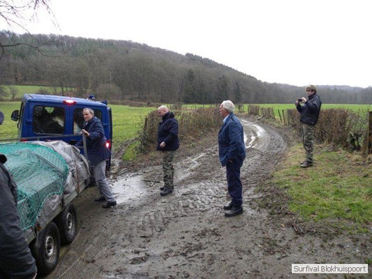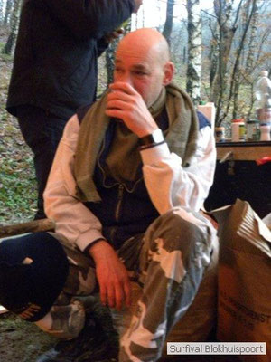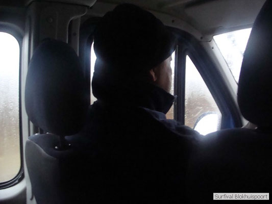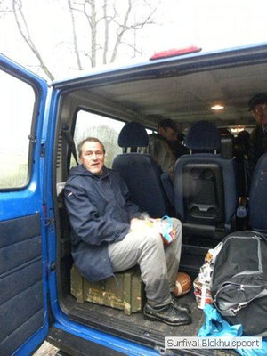 Dus vol goede moed begonnen we twee weken van te voren onze kin te verlengen. Maar drie dagen voor vertrek was de jeuk onhoudbaar en kwamen we allen gladgeschoren te tonele. Zo moet het waarschijnlijk voelen als je daadwerkelijk platjes hebt. In tegenstelling tot vorige editie vertrokken we niet vanaf het terrein van de PI de Marwei, maar leek het ons beter om vanuit PI Leeuwarden te vertrekken. Vol verwachting klopte ons hart, want er was een grotere deelnemerslijst ingevuld als ooit tevoren. Maar verwachting is teleurstelling. Paul v/d Help kwam met een geldige dokters verklaring, en geheel volgens teleurstelling zei Johan H af. Ook omdat hij nog niet had betaald. Bleven de mensen die geen geldige reden hadden voor absentie over, nl Frans, Roy, Dirk, terug van weggeweest Dicky v H Benjamin Bernie, Henk V. Omke & Romke en Pensionaris Jan. Jan had inmiddels van zijn vrije tijd nuttig gebruik gemaakt door alvast de aanhang wagen in te pakken, bus te huren en hout te hakken. We konden gelijk weg, ook omdat dit keer zelfs Dirk op tijd was. Aangekleed en wel. Dat er de dag van tevoren flink getafeld was door sommigen werd ons bij het passeren van de slagboom pijnlijk duidelijk. Foei! Ter hoogte van afslag 17 klaarde de lucht enigszins en werd er weer voorzichtig door de neus adem gehaald. De eerst stop voor een bakje koffie was de bij de Goudreinet, afslag 27. Ook een die hard survivaller moet met zijn tijd mee en nog voor het tweede bakje koffie kreeg een ieder het bericht op zijn smartfone dat er een sneeuwstorm over de Ardennen trok. Amai! Voorbij Utrecht klampte een lifter ons aan. Of hij een stukje mee mocht rijden. Zijn einddoel. Familiedag in Frankrijk. Omdat Dirk wat stilletjes voor in zat te genieten van weduwe Joustra, verzochten we de lifter om voorin plaats te nemen. Dirk had weer praat maar de lifter, Martijn genaamd, overstemde hem. Iets Unieks! Martijn was student en beheerde een omstreden website. Nadat de lifter bij een verlaten parkeerplaats was afgezet werd het liftprotocol ter discussie gesteld. Het was even zoeken in Eupen want de Aldi was verdwenen. Maar net als twee jaar daar voor stond hij op de zelfde nieuwe plaats. Hier troffen we Mr Guide Hans. Commander Hans had promotie gemaakt bij the Walliby squad. Gekleed in een nordface outfit, een bril met ontspiegelde glazen en een Walliby baret, stond hij er netjes op. Klaar om modder te happen met de Boyz. Omke & Romke lieten het shoppen dit keer over aan de anderen. En winkel kar met twee treetje schultenbrau moest genoeg zijn. En dit bleek inderdaad ruim onvoldoende voor de eerste paar uren aan het kampvuur.
