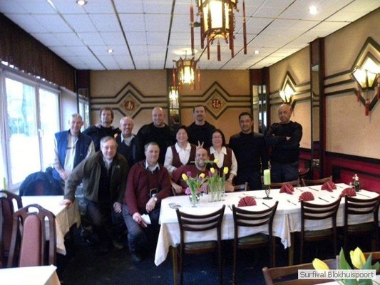 Het leek even droog te worden maar gelukkig gebeurde dat niet. Cmdr Hans onthaalde ons met een Frans ontbijt. Lekkere Broodsjus wachtend op omelet met ajuinen en look. Henk demonstreerde ons zijn Hans Klok act. Drie kwartier lang zat hij onder een deken. Totaal onzichtbaar voor de buitenwereld! Na twee paracetamol kwam de ontknoping. Hij had genoeg aan zijn hoofd waaronder een deken. Met de broodsjus achter de kiezen en shoarma tussen de tanden moest het kamp op worden gevouwen. Zo gebeurde. De schoenen kregen nog een laatste poetsbeurt in de beek en op naar de Chinees. Het was tenslotte ook al weer bijna 12 uur en voor het eerst droog. Na een feest der herkenning en ontlasting schoof een ieder aan voor een kostelijk maal. Wel met korting, stokjes en hete sambal! Toen nog een groepsfoto met ping en pong voor de bewijsvoering haasten we ons voor langs de lijn in de bus. Dat was het wel zo’n beetje. Groningen verloor de wedstrijd en omstreeks acht uur waren we weer thuis. Omke & Romke